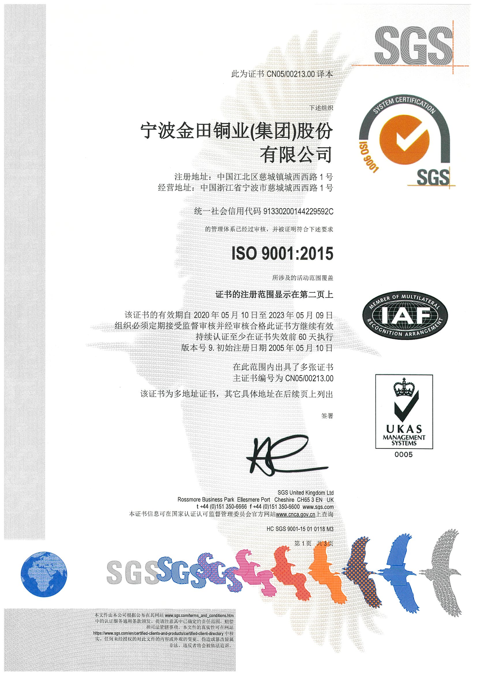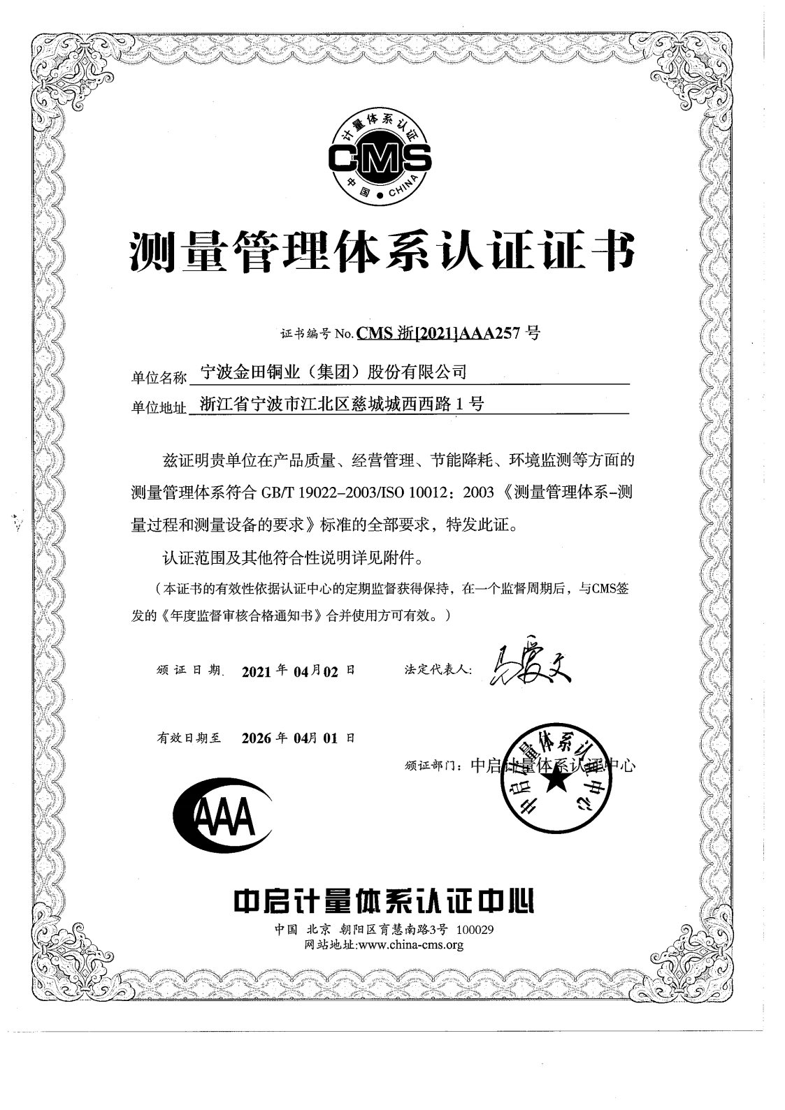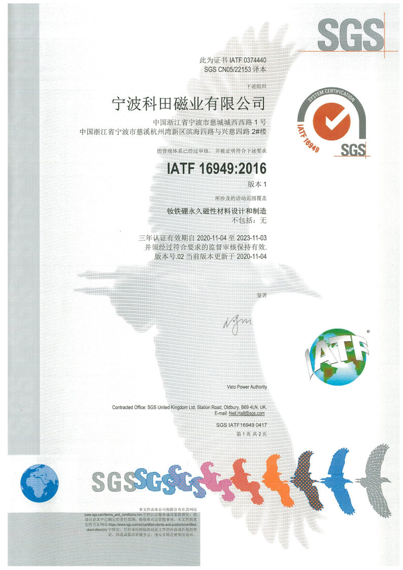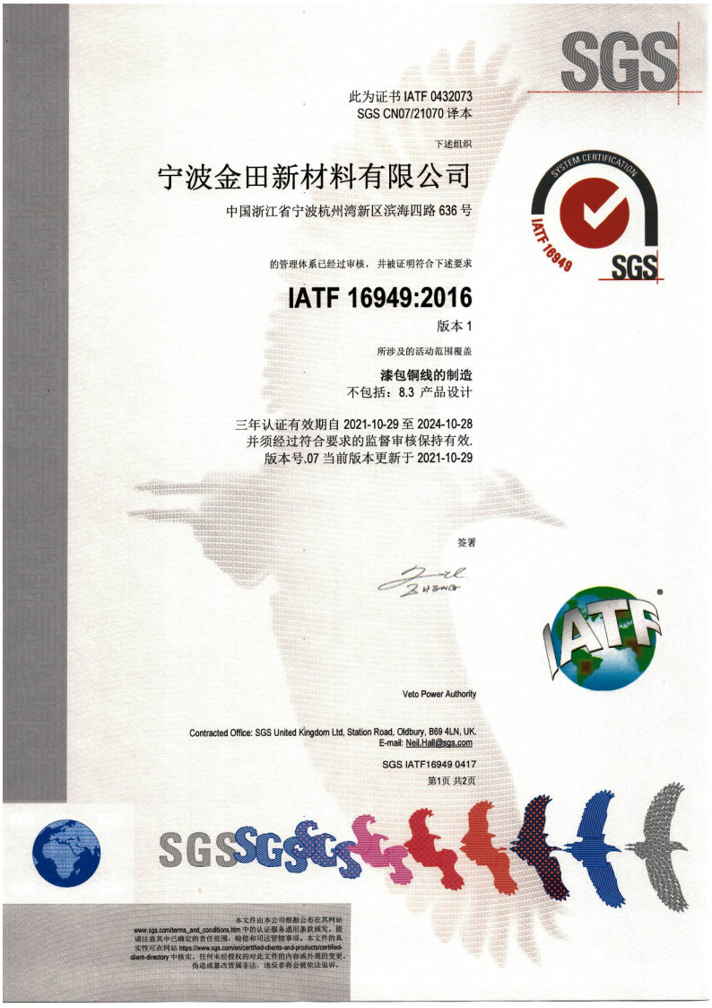 公司下屬分子公司寧波科田磁業(yè)有限公司、寧波金田新材料有限公司、高精度棒線公司分別通過IATF16949汽車行業(yè)質(zhì)量管理體系認(rèn)證。