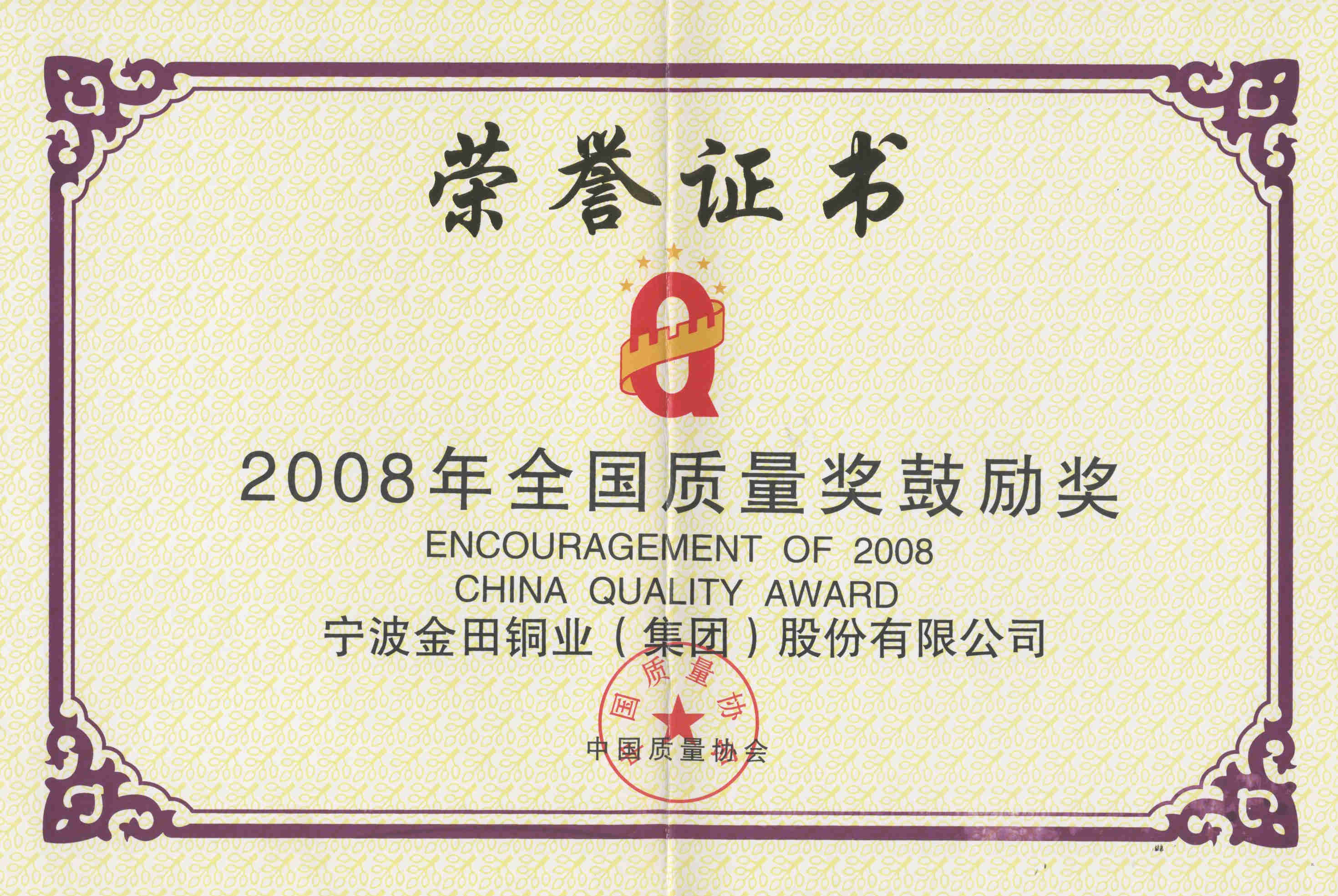 公司自2005年導(dǎo)入卓越績效管理模式以來持續(xù)深化卓越管理,榮獲寧波市首屆市長質(zhì)量獎(jiǎng)榮譽(yù)、浙江省質(zhì)量獎(jiǎng)和全國質(zhì)量獎(jiǎng)鼓勵(lì)獎(jiǎng)、全國卓越績效模式實(shí)施先進(jìn)單位。下屬子公司寧波金田銅管有限公司榮獲2015年度寧波市出口質(zhì)量獎(jiǎng)。